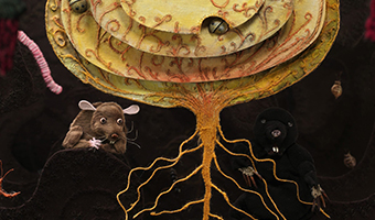 Mon prix de l’originalité pour cette séance revient à Naeris (Le Navet), film estonien de Silja Saarepuu et Piret Sigus, inspiré d’un conte slave. L’image est réalisée à partir de textiles divers et de broderie. Le monde de la surface est présenté en noir et blanc tandis que le monde dans la terre fourmille de vie et de couleurs. Les petites bêtes grouillent autour du navet semé par les jardiniers. La racine brille pour eux comme le soleil souterrain des Mondes engloutis. La taupe et le rat ont des têtes vraiment étranges voire un peu trop effrayantes à mon goût, mais certains petits enfants les ont trouvé rigolos et mignons.